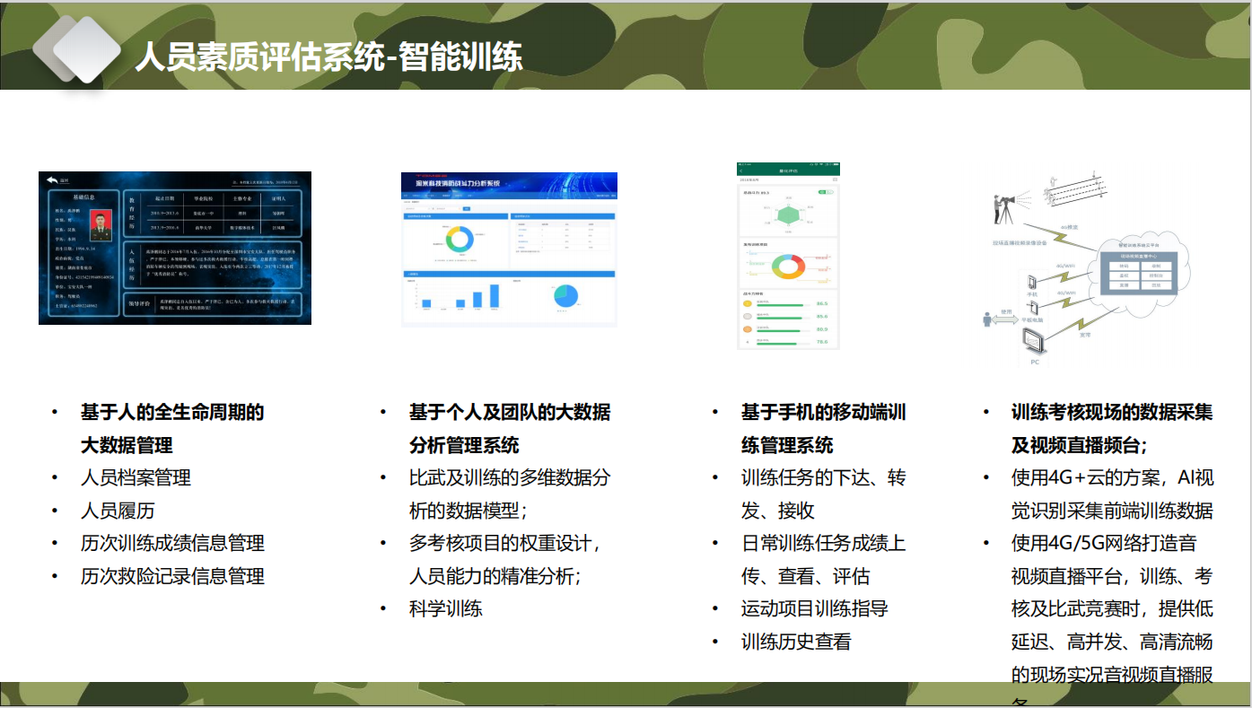 ➢生物特征识别检录子系统,是在训练、考核或比武竞赛过程中,需要对参加人员进行检录时,利用人的生理特征进行个人的身份鉴定,保证参加人员的真实性、准确性,杜绝伪冒和作弊现象。